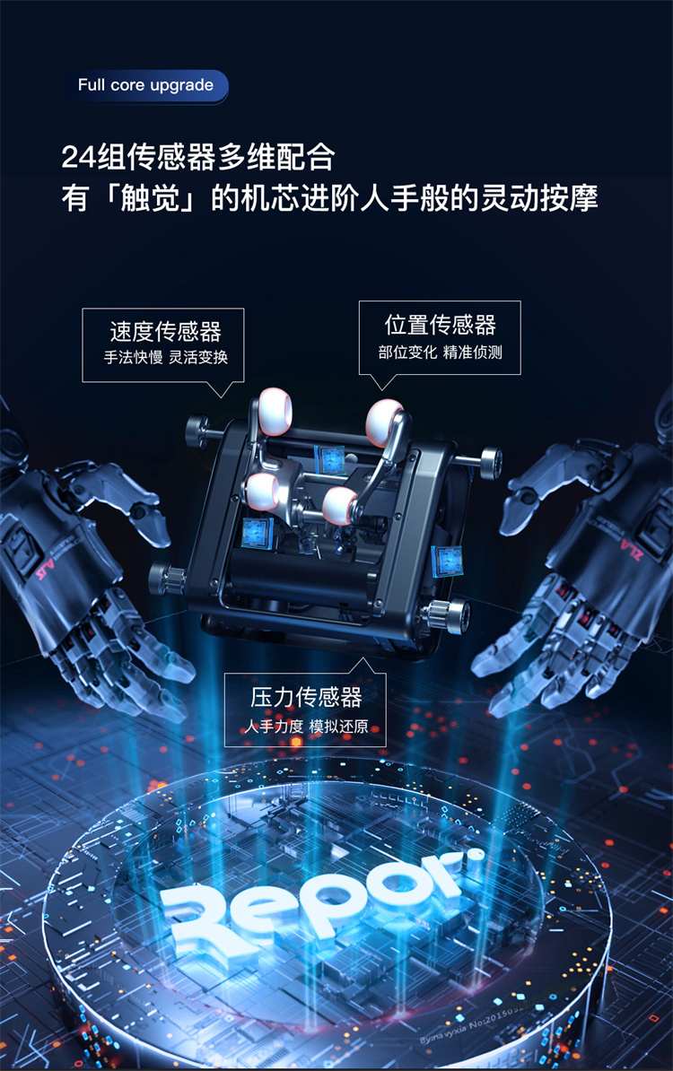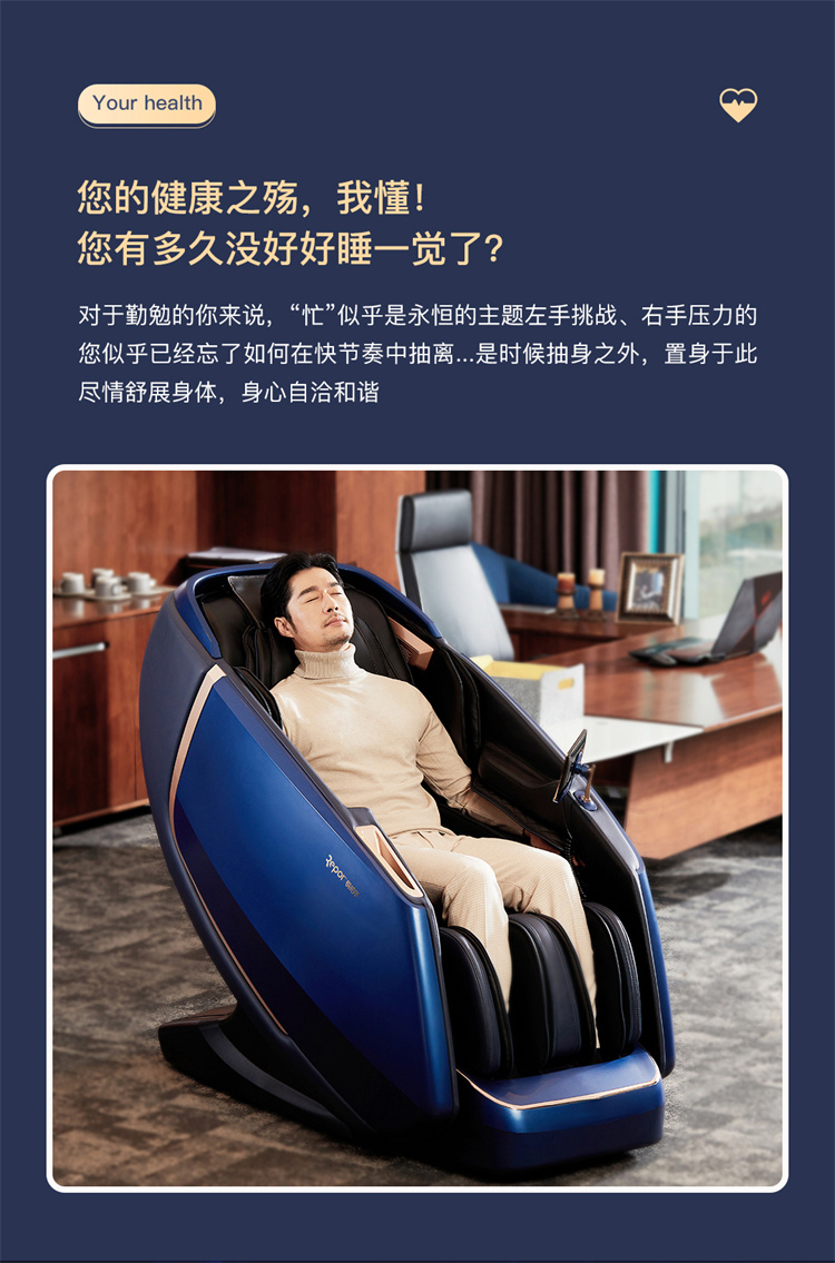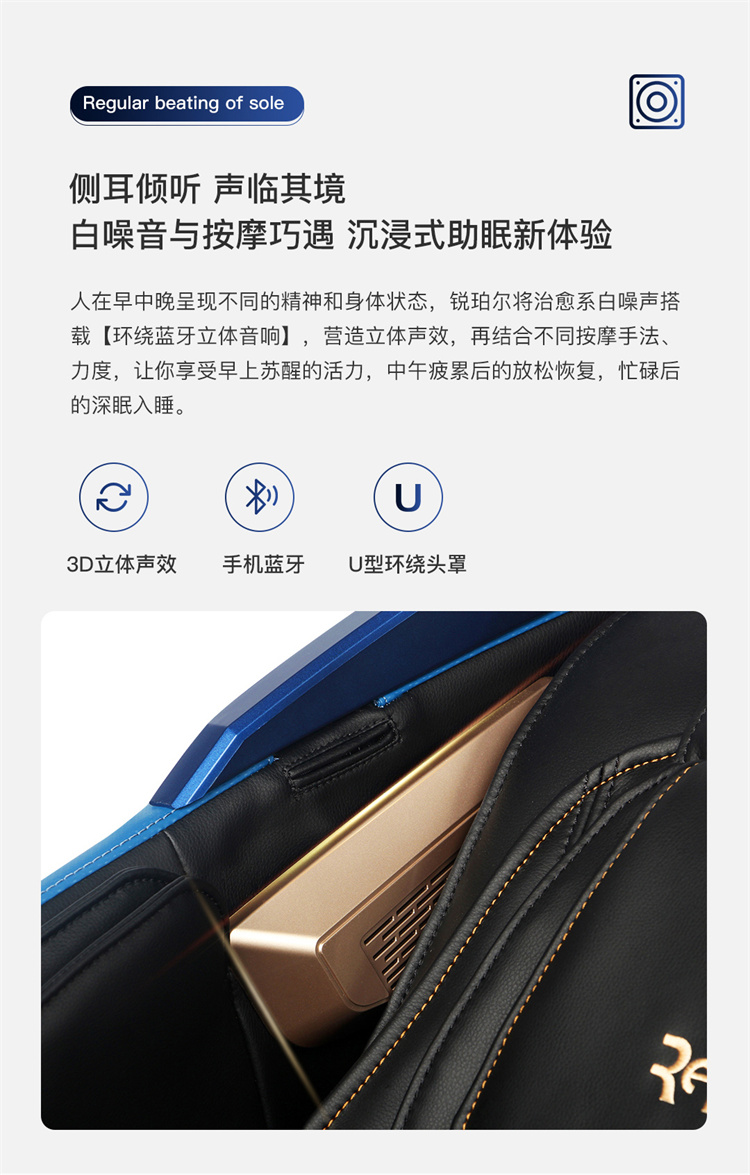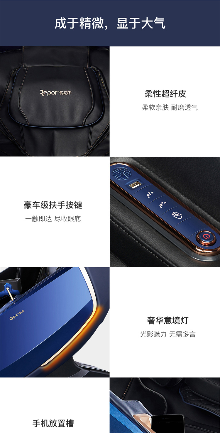 锐珀尔集十余年技术积累,倾力打造锐珀尔新款总裁4D穴感总裁椅S500,拥有全新的AI智能语音,小腿温热揉搓、脚底震动、4D机械手等全新功能创新,智能健康体测,可以检测血氧、心率、微循环等数值,通过大数据分析,给您提供合理的改善方法,时刻关注您的健康状况;超大液晶智能触控,专为总裁量身打造的特色按摩程序,20分钟快速补充精力,多种按摩程序,满足全家人的需求。