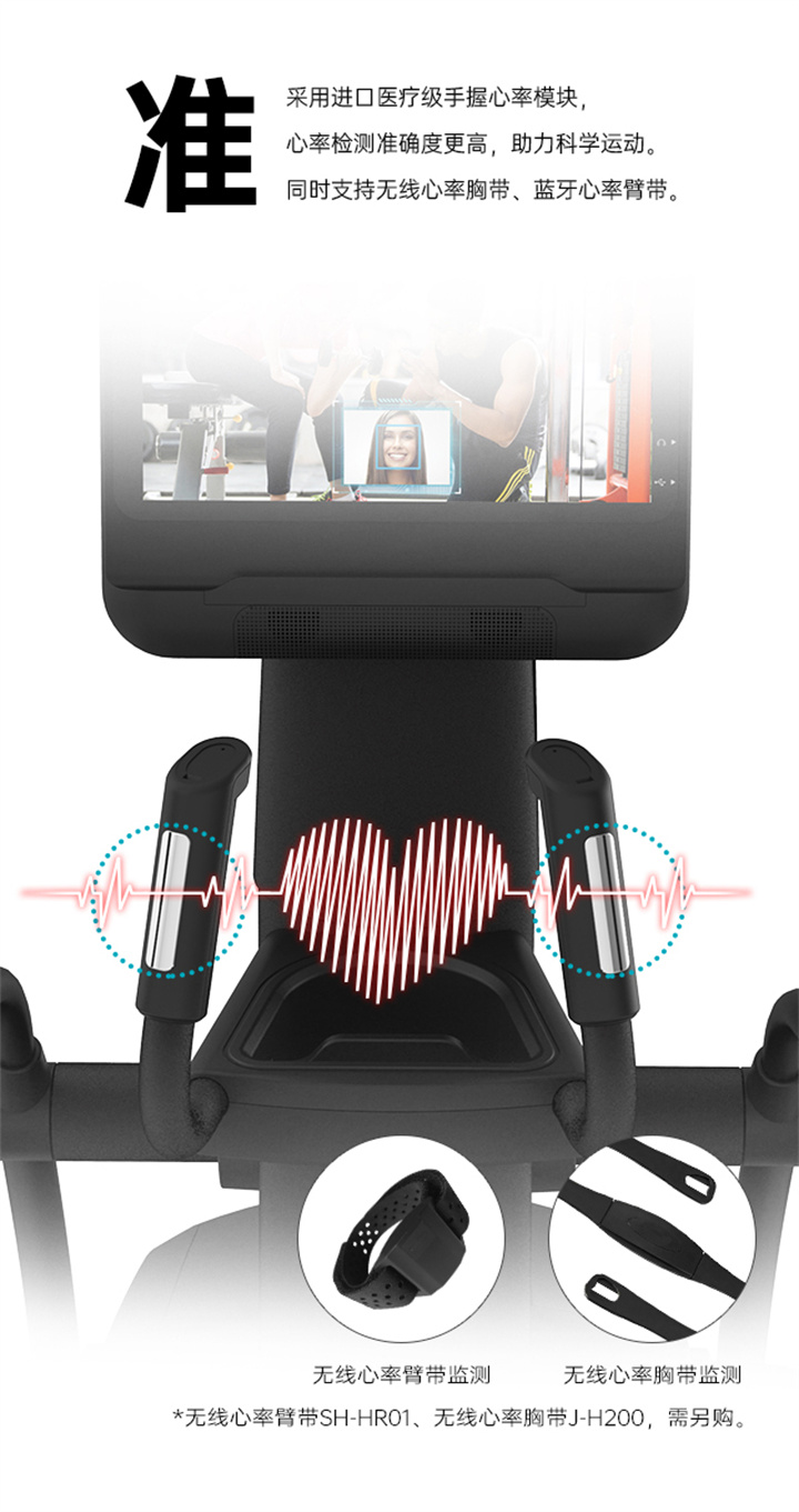 舒华商用椭圆机SH-B9100E(触屏版)采用电磁控系统的阻力系统,具有40段电磁控阻力系统,运用手握心率片侦测心率,9.3公斤飞轮质量。